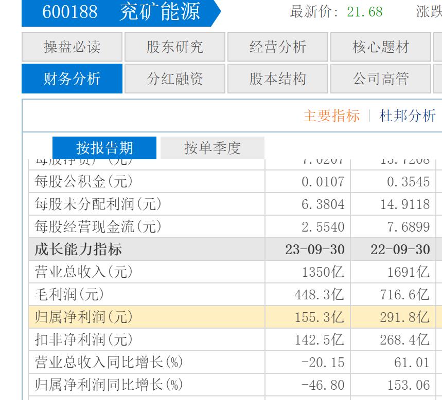 最新财报显示,中国神华在2023年的表现明显下滑,三季报财报显示前三季度营收2525亿元,同比增长0.79%,而此前两年同期的营收增幅则分别是40.30%和7.49%,营收增幅下滑较大。前三季度归母净利润482.7亿元,同比则出现18.40%的下滑,此前两年分别增长了21.48%和45.09%,2023年前三季度是最近三年来首次净利润下滑。2023年前三季度业绩大幅下滑的还有兖矿能源,总营收1350亿元,同比下滑20.15%,归母净利润155.3亿元,同比下滑46.80%。而上一年同期营收增幅则是61.01%,净利润增幅高达153.06%。可见2023年前三季度传统能源股的业绩差强人意不是个例,而是行业普遍情况。