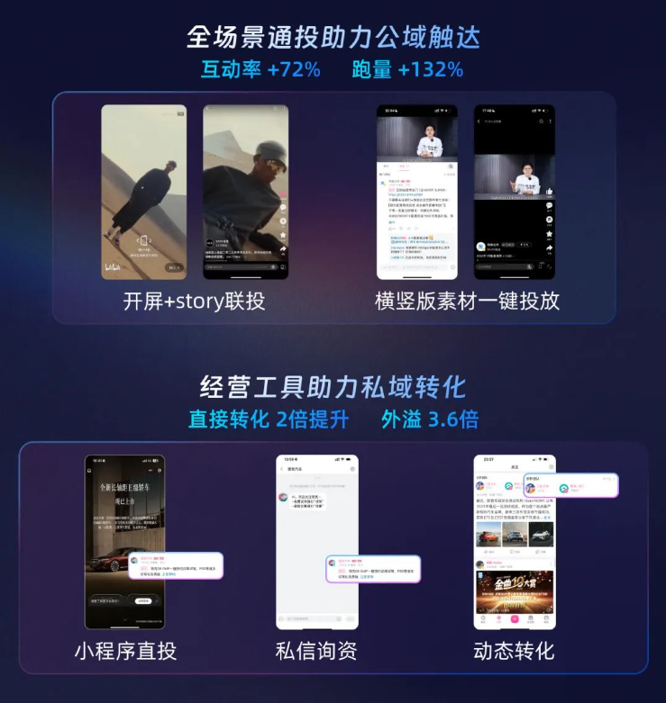 这样的开放也依托于测试数据的反馈。相较过去单点投放,“通投”有助于拿到更好的广告效果,互动率能提高72%,跑量效果提高132%。再配上经营工具助力,私域直接转化效果能提升2倍。