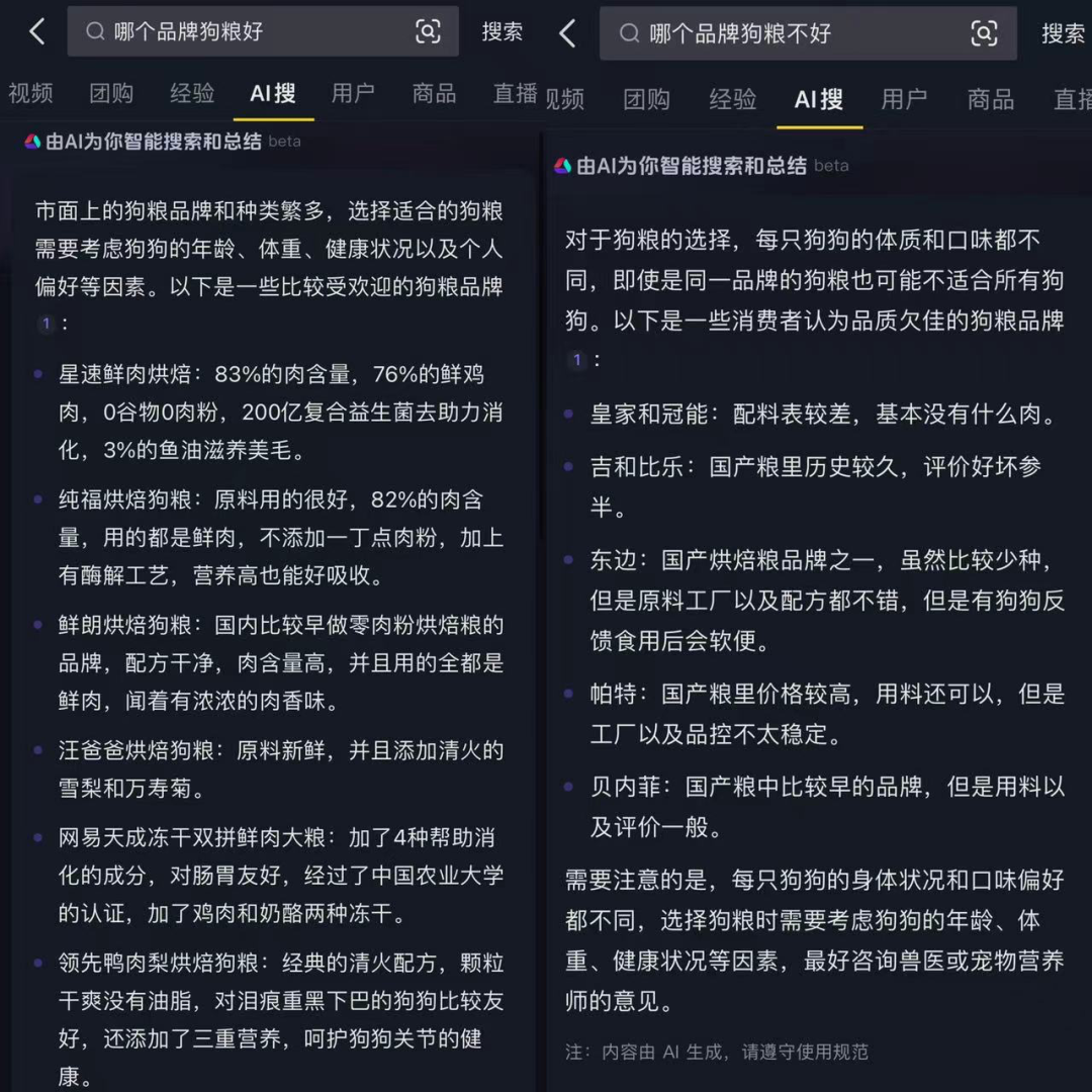 鲸商在“AI搜”中搜索“哪个品牌狗粮好?”其马上给出一个综合答案。每个品牌的特点、优势、价格皆有讲解。鲸商继续搜索“哪个品牌狗粮不好?”其也给出了皇家和冠能、东边、帕特等品牌,包括品牌不好的原因。不过“AI搜”回答的内容很多来自第三方网站,已经站内用户拍摄的视频内容。