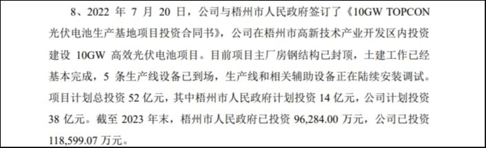 具体来看,2022年7月20日,沐邦高科与梧州市政府签订了投资合同书,公司拟在梧州市高新技术产业开发区内投资建设10GW高效光伏电池项目。项目计划总投资52亿元,其中梧州市政府计划投资14亿元,沐邦高科计划投资38亿元。
