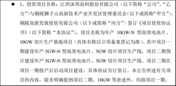 随后,沐邦高科陆续发布公告拟在广西梧州和湖北鄂州市各建10GW TOPCon电池片项目,两个项目披露的投资总额刚好达到100亿元。