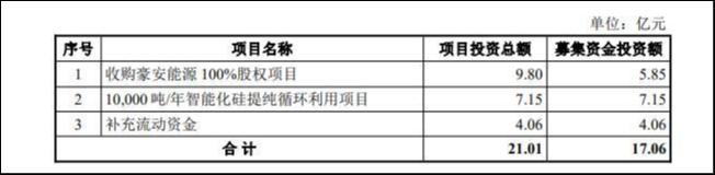 无论募资额如何变化,但沐邦高科的资金投向始终围绕“收购、扩产、补流”展开,即收购豪安能源100%股权项目、10000吨/年智能化硅提纯循环利用项目和补充流动资金。