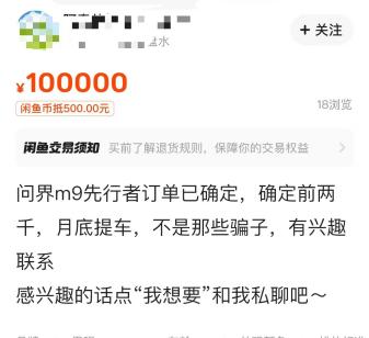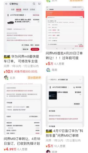 今天回来一看,好家伙,咸鱼上,黄牛们大量倒卖M9的大定订单,少则加价1千、2千块,多的加价9万块。