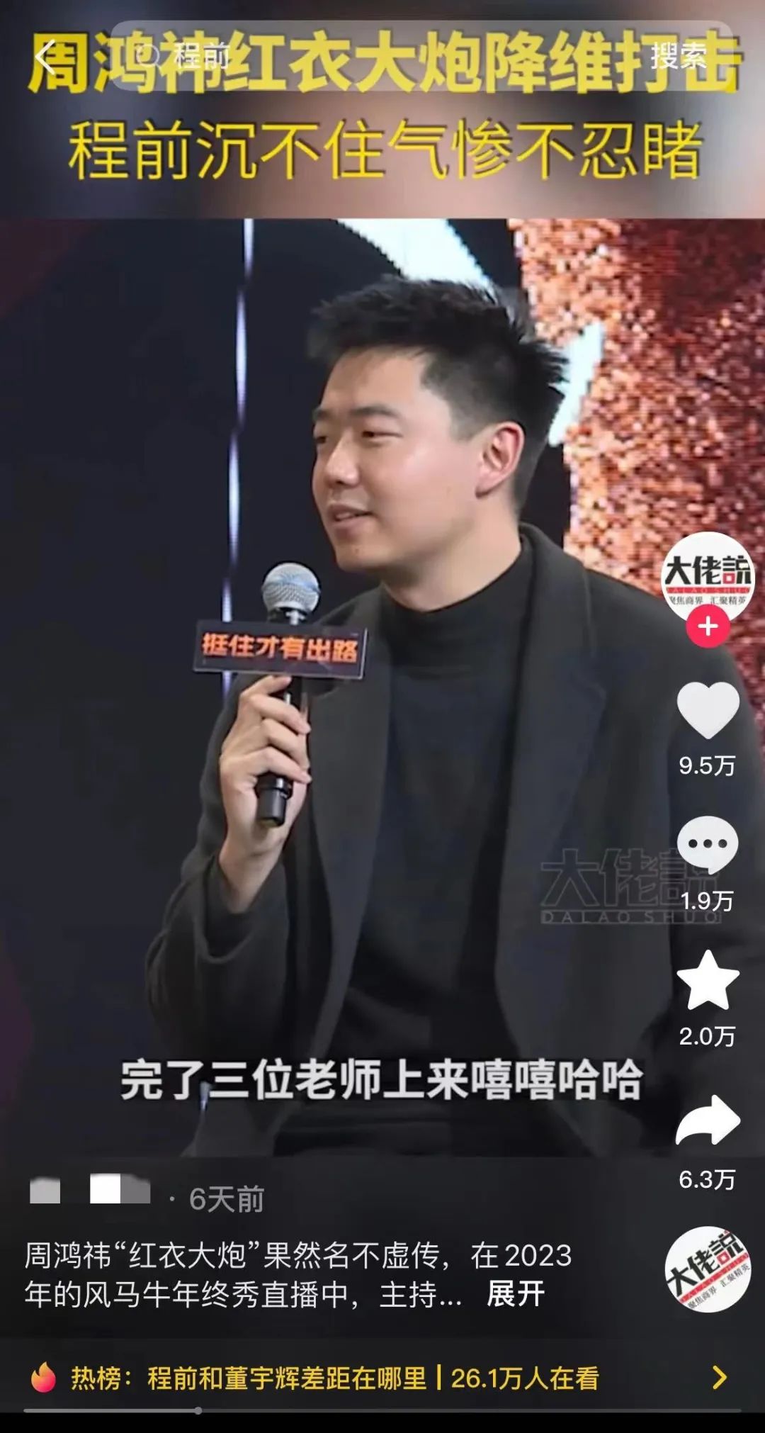 在冯仑主办的“2023风马牛年终秀”上,程前作为年轻创业者与商业访谈博主,与王石、周鸿祎、冯仑三位大佬对谈。对谈中,程前有些“失控”,提及只有自己“认真准备了演讲稿”,场上几位嘉宾的态度却“嘻嘻哈哈”。周鸿祎回答问题时多次打断其讲话,引得周鸿祎反问“你是speaker(演讲者),还是主持人?”![]()