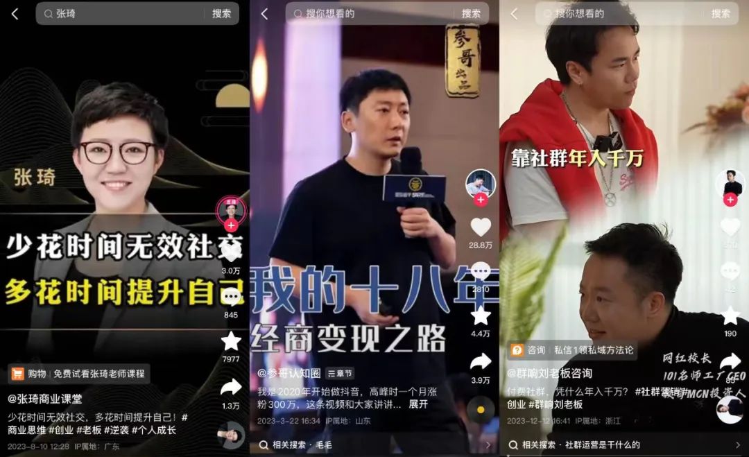 不过,在舆论之外,程前所代表的商业网红,也在进一步走进大众视野。从罗振宇、吴晓波,到如今短视频平台年入上亿的商业导师张琦、参哥、刘思毅,再到带火了商业访谈短视频的程前。网红商业博主这门生意已经从知识付费裂变出了各种玩法,目标受众也从中产下沉到三四线,诞生出“创富博主”细分赛道,支撑起了一个庞大的IP商业帝国。![]()