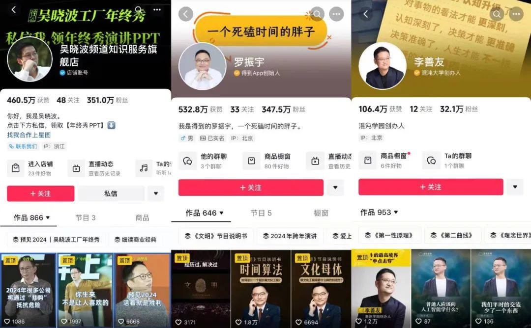 而商业博主和赚钱、创业息息相关,自然备受用户青睐。第一代商业网红罗振宇、吴晓波、李善友就已经利用这种心理和打法,在中产阶级用户中赚的盆满钵满。![]()