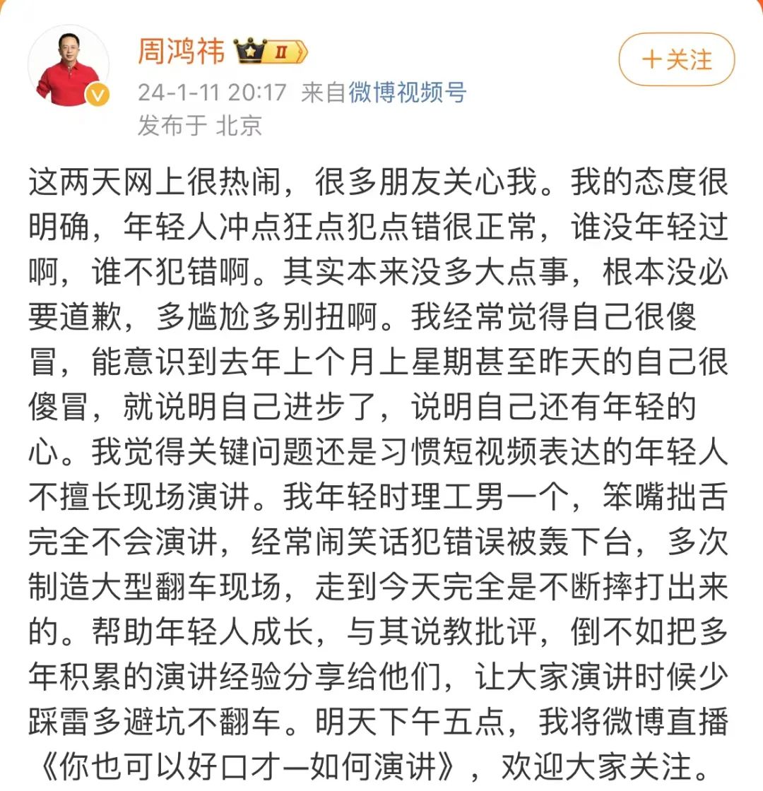 在程前公开道歉后,周鸿祎发问表示,“年轻人犯错很正常,与其说教批评,倒不如把多年积累的演讲经验分享给他们”,顺便预告了自己的直播公开课《你也可以好口才—如何演讲》。![]()
