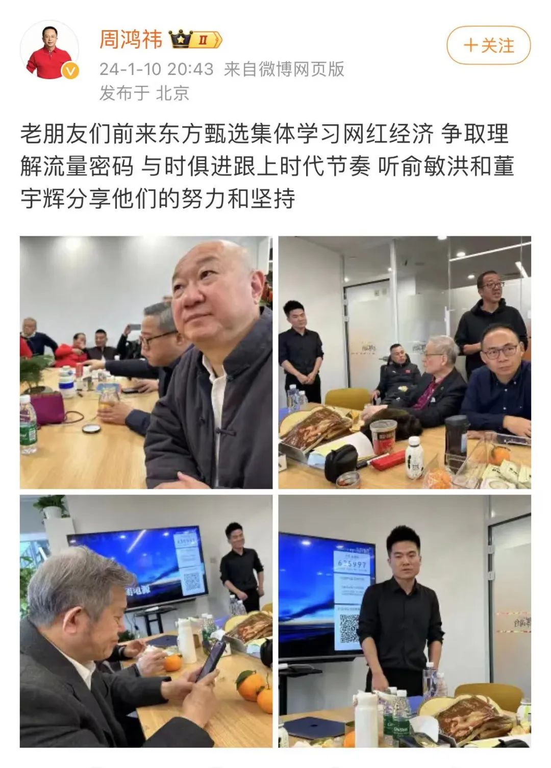 前脚程前的风波还没平息,后脚俞敏洪就拉着冯仑、周鸿祎、陈东升等大佬集体参观东方甄选学习“网红经济”,得意弟子董宇辉现场互动,从流出来的现场视频来看,董宇辉凭借高情商与口才博得满堂彩。事后,也有多位大佬晒出了董宇辉的这次经历。周鸿祎发微博称:“老朋友们前来东方甄选集体学习网红经济,争取理解流量密码,与时俱进跟上时代节奏,听俞敏洪和董宇辉分享他们的努力和坚持。”![]()
