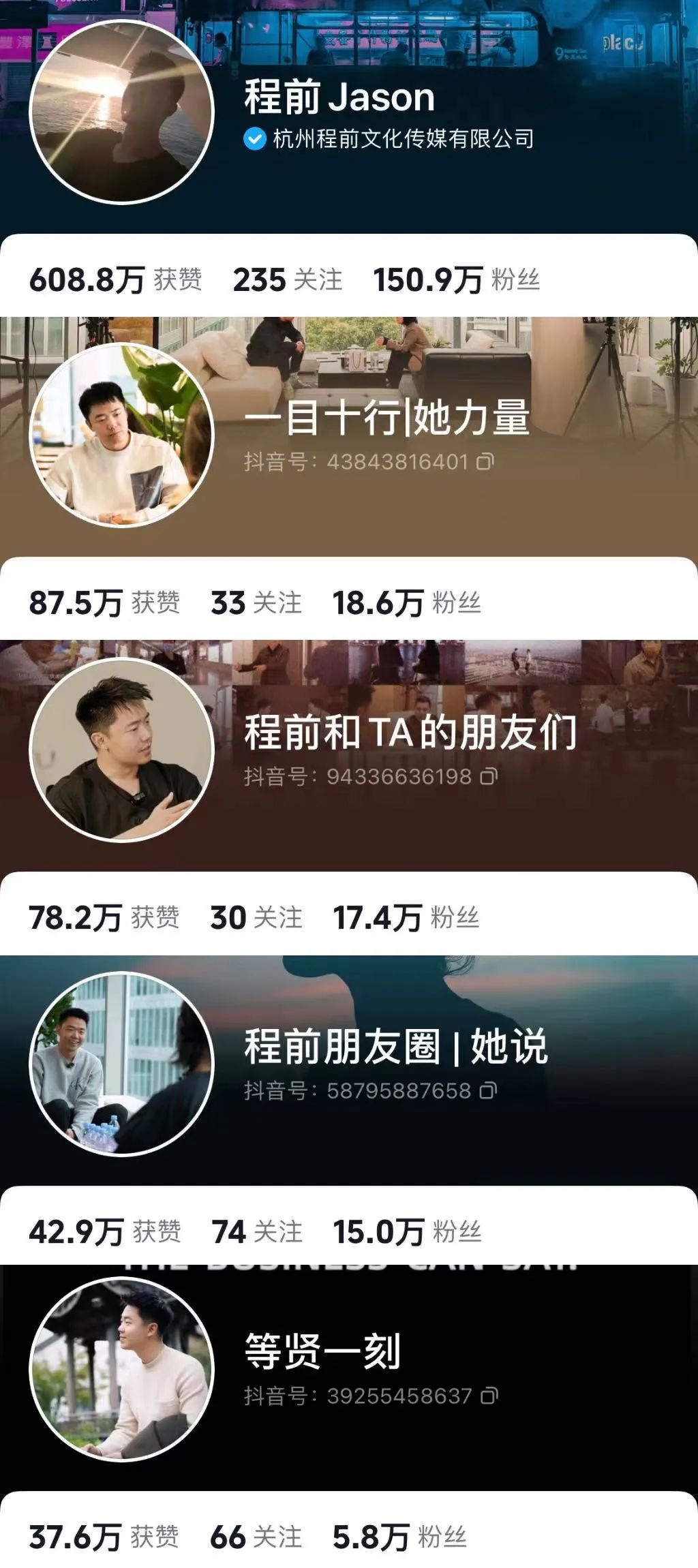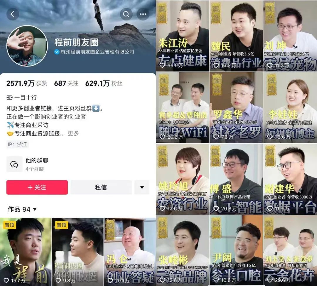 “程前朋友圈”走红后,他开始建立账号矩阵,目前旗下还有程前jason(个人观点分享)、一目十行 | 她力量(针对女性创业者)、程前和TA的朋友们、程前朋友圈 | 她说、等贤一刻等多个子账号,全网累计粉丝超过千万。![]()