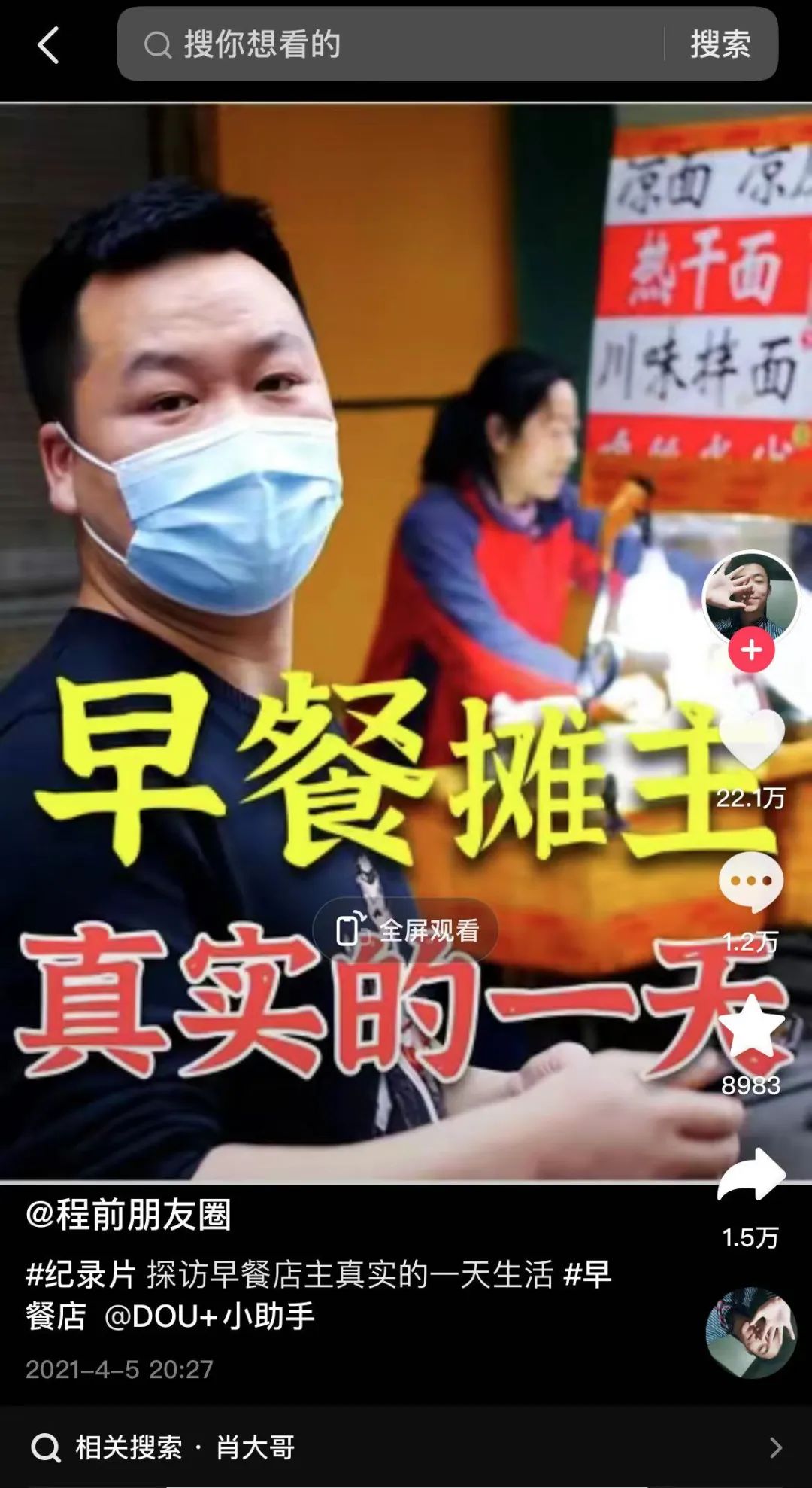 “程前朋友圈”的第一条抖音视频发布于2021年4月5日,内容为《探访早餐摊主真实的一天生活》,获得了超 20 w+点赞,直接爆火。![]()