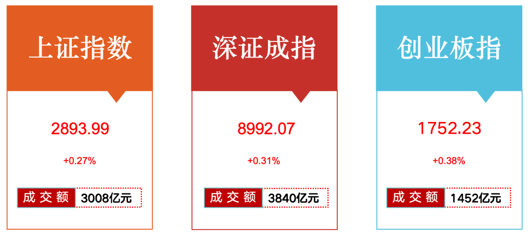 今日收盘,沪指报2893.99点,涨0.27%;深成指报8992.07点,涨0.31%;创指报1752.23点,涨0.38%。两市成交额6848亿元,较上一交易日放量739亿元,超3500只个股下跌。今日,北上资金净流出8.07亿元、净卖出41.33亿元,其中沪股通净流入17.07亿元、净买入1.69亿元;深股通净流出25.14亿元、净卖出43.02亿元。