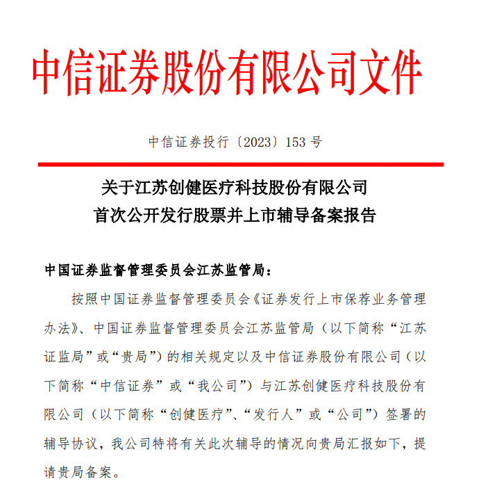 近日,中国证监会发布的《关于江苏创健医疗科技股份有限公司首次公开发行股票并上市辅导备案报告》显示,2023年12月28日,创健医疗与中信证券股份有限公司签署辅导协议,正式启动A股IPO进程。