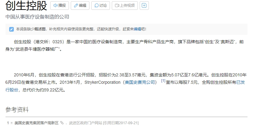 2010年6月,创生控股在香港联交所主板成功上市,共募集资金7.5亿港币,每股发行价3.52港币,也成为了中国内地第一家在香港上市的骨科医疗器械企业。而那个时候也正值跨国公司开启并购热潮,后来创生控股于2013年被美国的医疗科技公司史赛克收购,总收购额达59.22亿港元。
