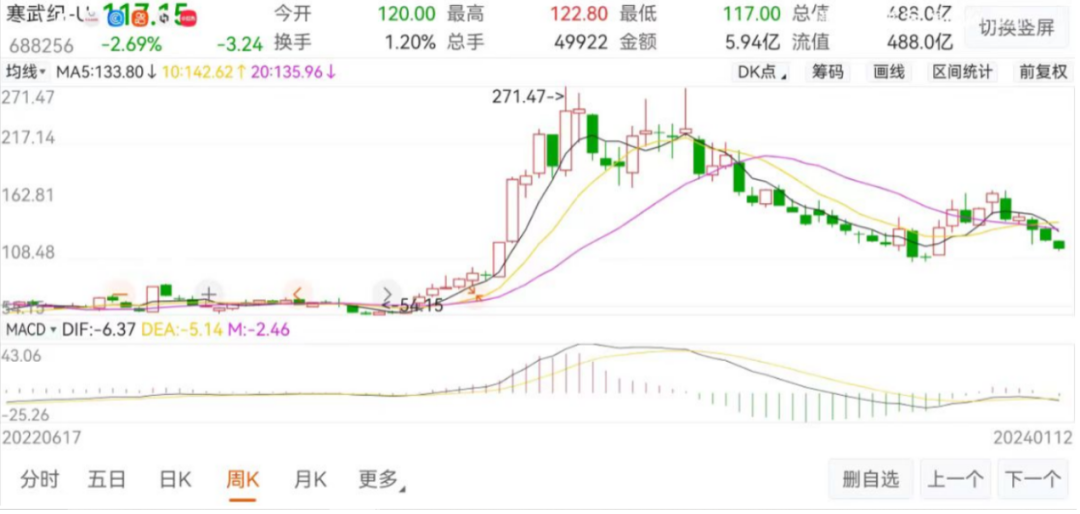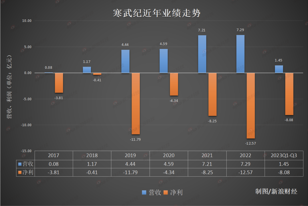 距离2023年4月份公司股价最高271.47元每股,目前寒武纪股价已下跌超过56.85%,市值腰斩。股价大起大落的同时,2023年以来,寒武纪公司逐季营收持续同比下滑——前三季度,公司营收1.45亿元,同比下滑44.84%;同期亏损累计8.08亿元。