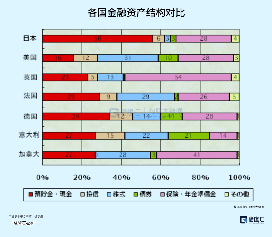 下图是日本银行做的各国金融资产结构对比图,蓝色的代表股票,绿色的代表债券。