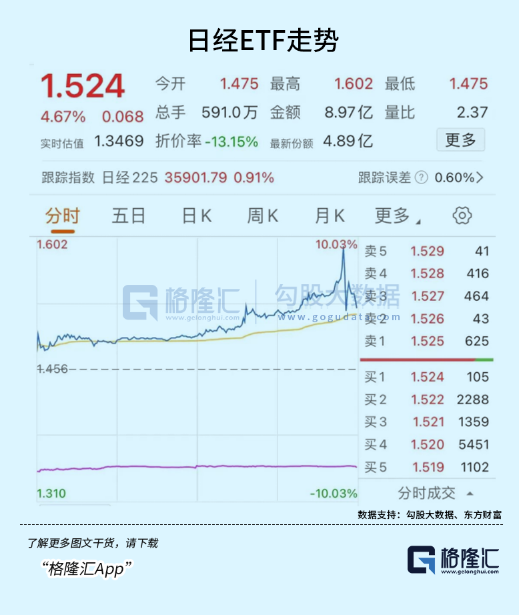 今天,日经ETF一度涨停!尾盘跳水,当前溢价13%,今日成交9亿元。
