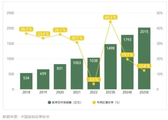 此前,中国连锁经营协会新茶饮委员会联合美团新餐饮研究院,在上海共同发布了《2023新茶饮研究报告》(以下简称“报告”)。《报告》显示,全年新茶饮消费市场规模有望达到1498亿元,恢复3年复合增长率近20%的水平,连锁化率整体稳定。至2025年,国内消费市场规模预计进一步扩张至2015亿元。
