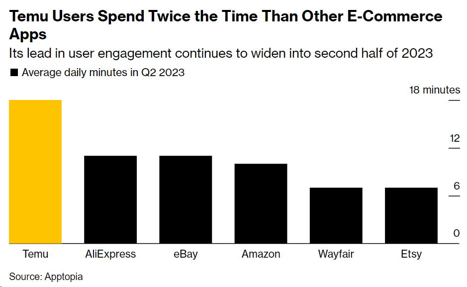 研究公司Apptopia的数据显示,2023年第二季度,美国购物者在Temu上花费的时间几乎是亚马逊等主要竞争对手应用程序上花费时间的两倍。消费者每天在Temu的应用程序上花费18分钟,而在亚马逊上花费10分钟。
