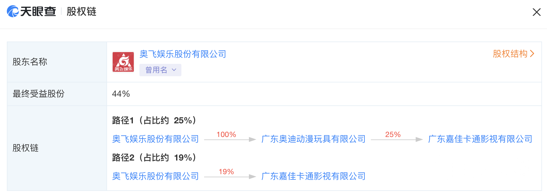 钛媒体APP注意到,赵冬梅与奥飞娱乐的关系较为密切。赵冬梅还在奥飞娱乐控股公司广东嘉佳卡通影视有限公司(下称嘉佳卡通)担任董事兼总经理的职位,奥飞娱乐合计持有嘉佳卡通44%的股份。
