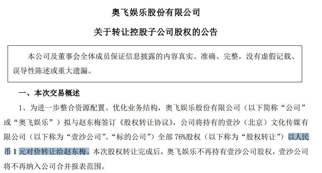 1月16日晚间,奥飞娱乐(002292. SZ)发布公告称,公司拟将控股子公司壹沙(北京)文化传媒有限公司(下称壹沙公司)76%股权以1元价格转让给赵东梅。本次股权转让完成后,奥飞娱乐不再持有壹沙公司股权,壹沙公司将不再纳入公司合并报表范围。