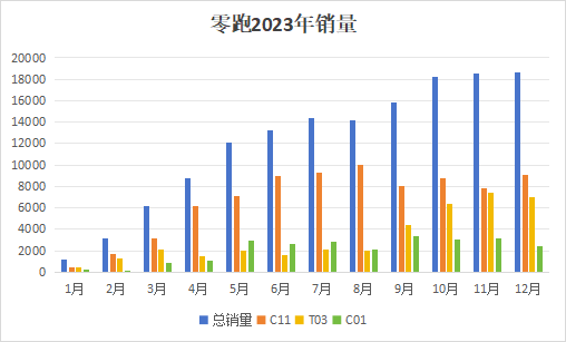 2023年,零跑销量达到了14.42万辆,同比增长超过29%。从数据上来看,零跑的表现还不错,尤其是在2023年最后的三个月,销量一直维持在1.8万辆以上,创下了交付以来的最新高。零跑2023年的原定销量目标是20万辆,最终的成绩与目标仍有较大差距。