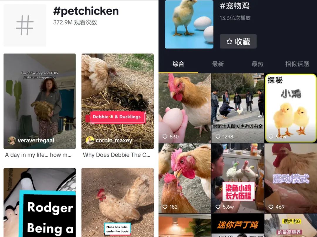 在国外,TikTok上有关“宠物鸡”的视频播放量已达3.72亿;在国内,抖音上与“宠物鸡”相关的视频播放量已达13.3亿次,小红书上也不乏有宠物鸡的主人分享养鸡日常。这些所谓的“宠物鸡”里,既有芦丁鸡、矮脚鸡、塞拉玛鸡等品种鸡,也有不少常见的公鸡母鸡。