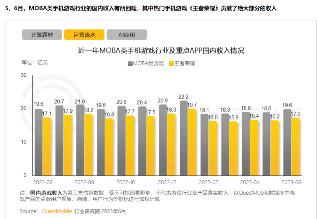 根据QuestMobile用户数据,2023年上半年,《王者荣耀》平均月活为1.4亿,在游戏类目中排名第一。这个数字相较于以往未能实现大幅增长,2022年12月为1.5亿,2022年1月为1.6亿,2021年每月则在1.3亿到1.7亿之间。而在巅峰期,月活可达2亿+。![]()