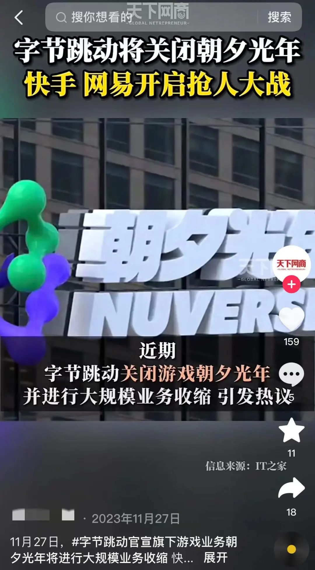 2023年11月底,字节跳动正式官宣,大规模收缩游戏业务,保留部分创新型游戏探索。![]()