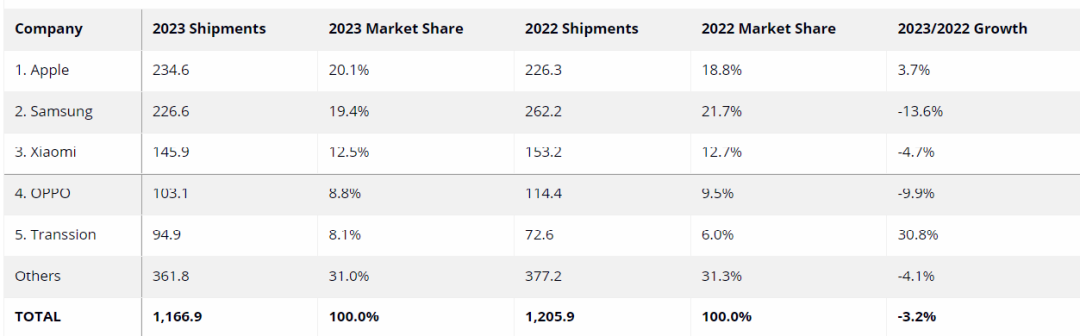 苹果虽然是前三强之中唯一在2023年实现了正增长的手机厂商,但并非高枕无忧。