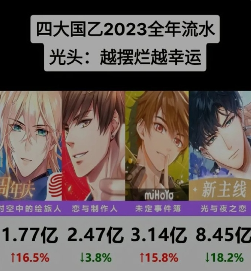 都知道女玩家的钱好赚,都想来赚这笔钱,但在目前的国产乙游市场,腾讯的《光与夜之恋》遥遥领先,处于一超多强的地位,2023年的流水比其他三大国乙加起来还要高。