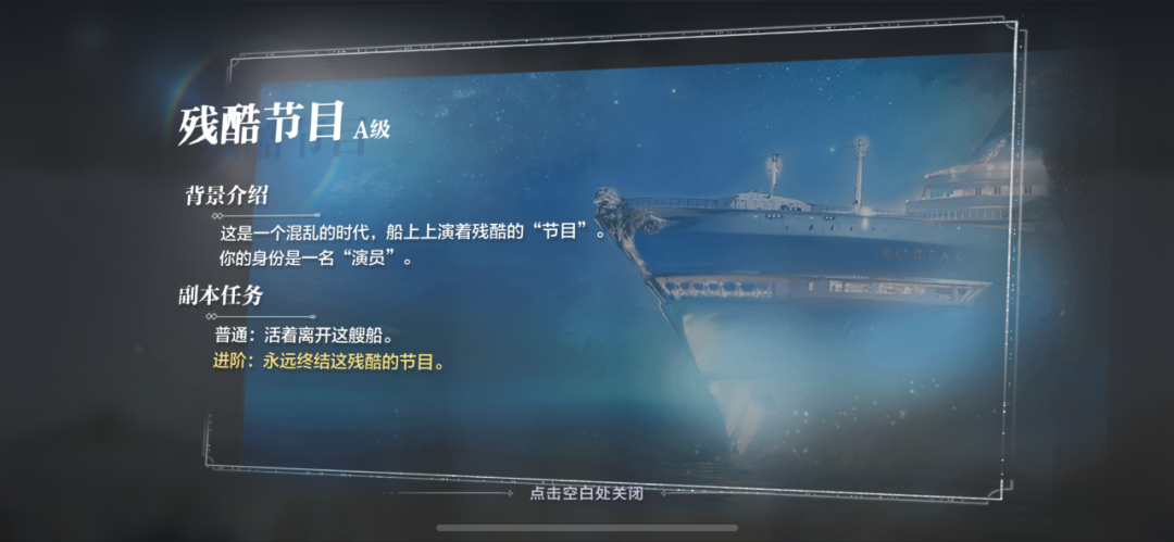 惊喜之处在于,《世界之外》主打的无限流剧情在国产乙游中比较新鲜,而且网易也确实在认真做剧情,一打开游戏就进入了游轮残酷节目,副本世界闯关流的模式紧张感和刺激感都有,这应该是《世界之外》最大的卖点。