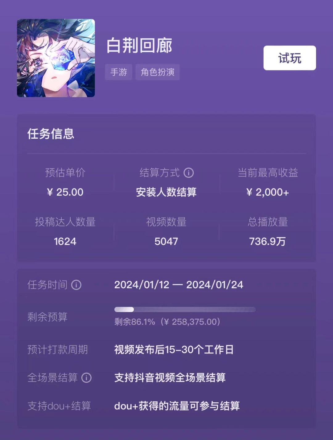 《白荆回廊》项目组产品上线当天就发布了抖音发行人计划,目前吸引了超过1600名达人参与内容创作,相关内容视频超过5000多条,总播放量有700多万次;