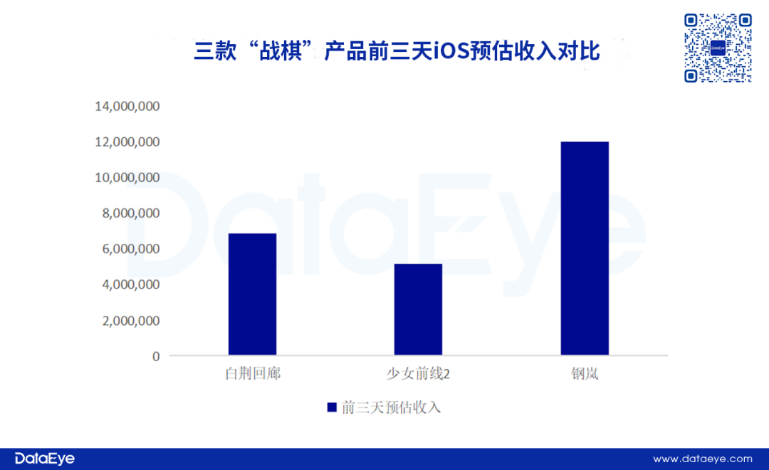 点点数据预估收入数据显示,《白荆回廊》首日iOS端预估收入接近200万人民币,而后进入周末两天,单日预估收入拉升至250万人民币左右。该产品上线三天,累计收入接近700万人民币。目前iOS畅销榜稳定在TOP20内。对比来看,《白荆回廊》上线前三天iOS端预估收入略高于同类型产品《少女前线2:追放》,低于《钢岚》。