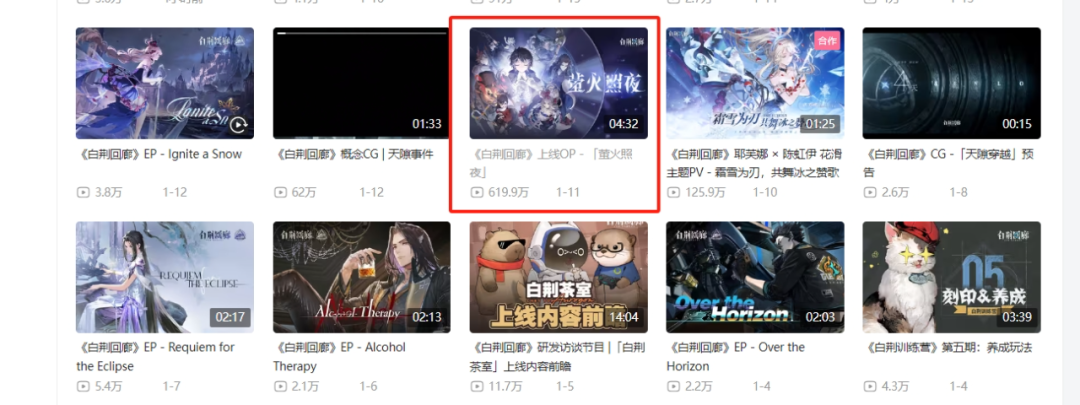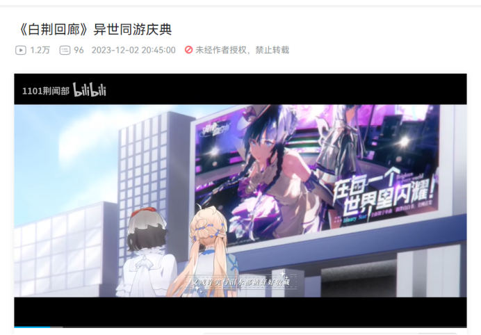 项目组《白荆回廊》在去年12月2日产品定档的时候,项目组就发起了“异世同游庆典”二创活动,并且邀请了不少知名B站UP参与,以动画、短剧、翻唱、COS等各种方式制作与游戏相关的内容。不过从数据来看,目前总播放量仅有1.2万次。