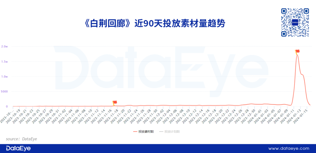 DataEye-ADX数据显示,《白荆回廊》在去年11月17日终极测试之后开始进行测试素材投放。在今年初进入产品预热阶段,投放素材量有所提升。直到产品上线前一天(1月11日)买量素材开始飙升,而在产品上线当天继续飙升,达到投放素材量峰值。可是在上线后,投放素材量快速下滑。