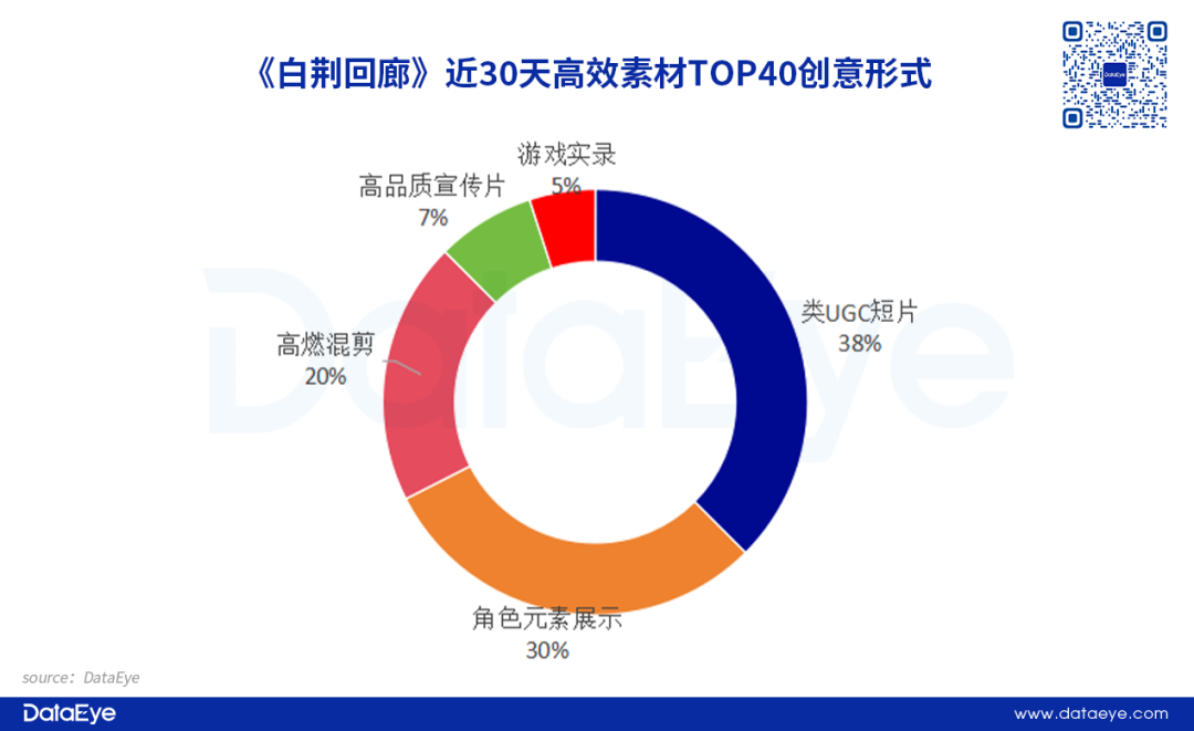 DataEye研究院整理了《白荆回廊》投放计划数TOP40的高效素材,其投放素材创意形式主要分成五种类型,分别是“类UGC短片”“角色元素展示”“高燃混剪”“高品质宣传片”以及“游戏实录”。