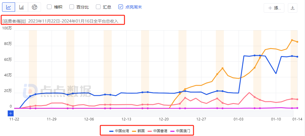 上述一系列操作之后,《菇勇者传说》首月在港澳台地区斩获了5200万的双端流水,12月中下旬,《菇勇者传说》趁势上线韩国市场(韩服名称《버섯커 키우기》)。