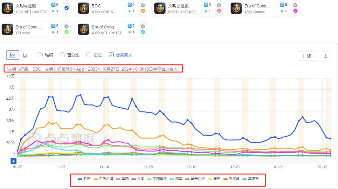 作为一款画风、玩法、多文明背景均面向全球的产品,《EOC》依然是在港澳台、日韩这几个4399积累深厚的市场表现最优,美国成绩整体居中,欧洲则稍显吃力。