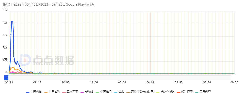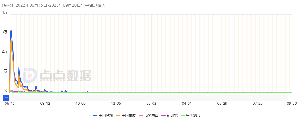 而以区域市场对总流水的贡献来看,中国台湾以2156万的成绩位列TOP1,韩国以1197万、中国香港以1193万、日本以982万、美国以529万分别位列第2至第5名。