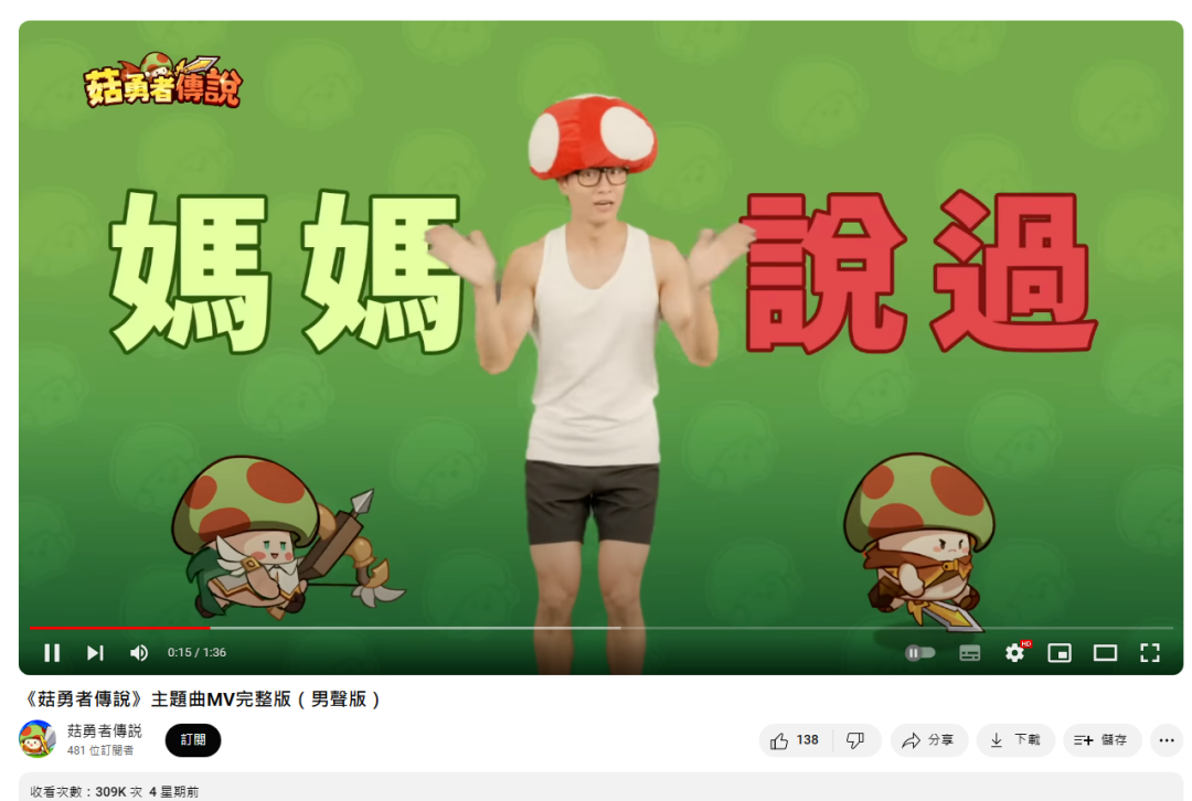 如此成绩加持下,11月23日《菇勇者传说》(《冒险大作战》港澳台APP版本名称)正式上线港澳台市场,接近“孤勇者”的谐音取名为其带来不少自然流量,也为宣推提供了方便,例如特意制作的魔性主题曲《菇菇是勇者》。