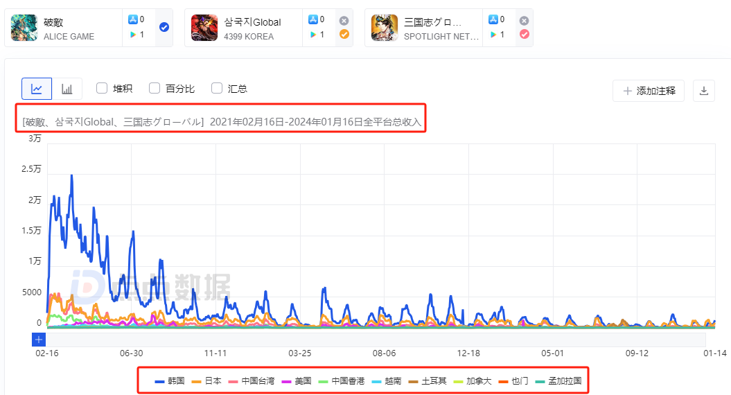需要特别关注的是,虽然《天姬物语》早期的优势市场是韩国,但其2023年在韩国之收获不到10万,去年流水大头都来自日本市场。