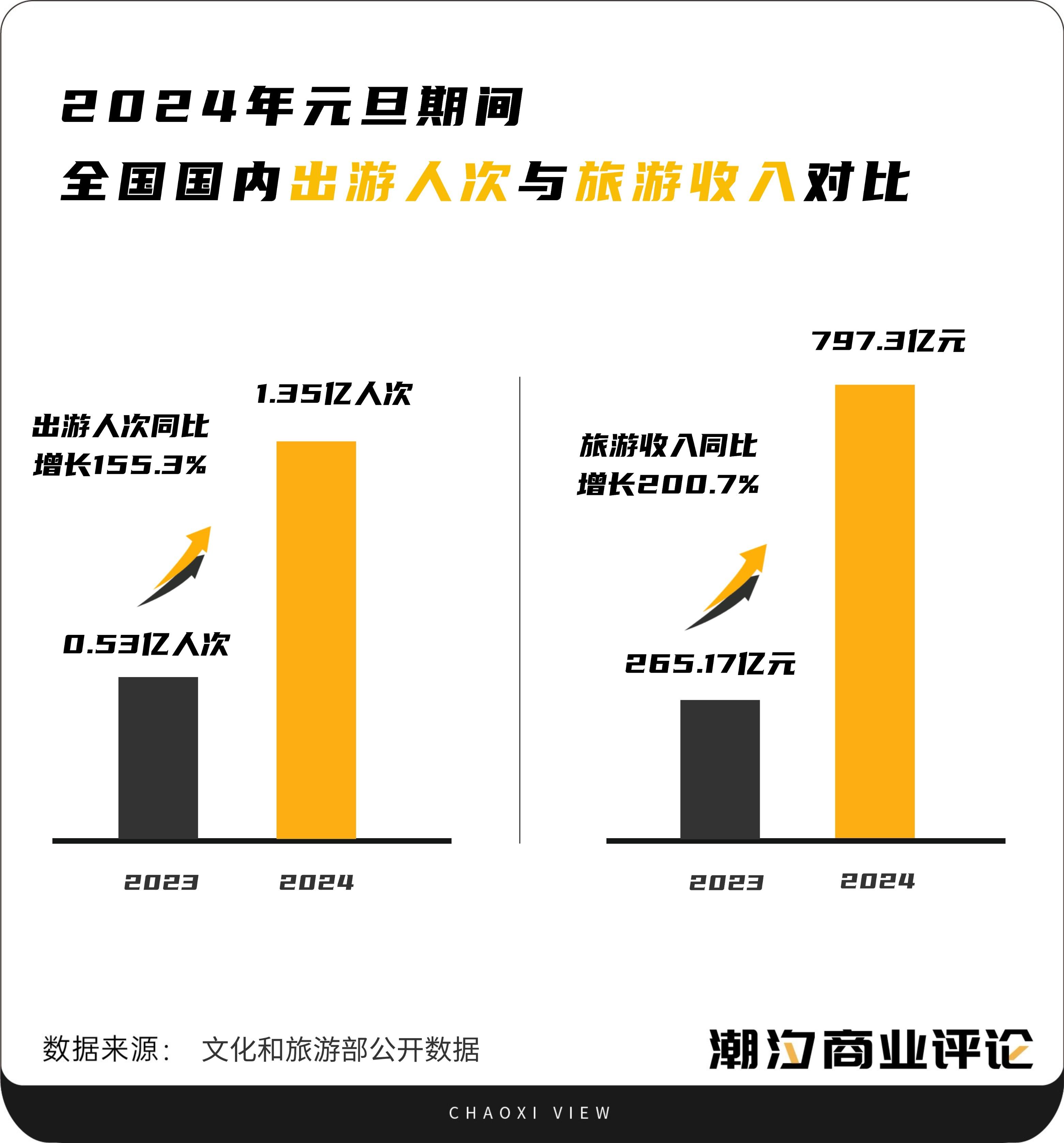 这股热浪大有持续之势。作为2024年旅游业的开端,元旦期间全国国内旅游出游1.35亿人次,同比增长155.3%;实现国内旅游收入797.3亿元,同比增长200.7%。因“南方小土豆”话题爆火的哈尔滨,就是境内众多旅游目的地中的佼佼者。