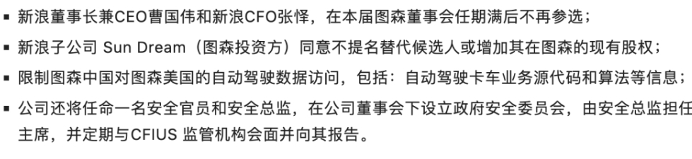 2022年2月,因为自动驾驶相关的技术和数据安全,图森未来与美国政府机构达成了一系列协议,以解决围绕其自动驾驶卡车业务以及该公司与中国关系的安全问题,其中就包括限制图森中国对自动驾驶数据的访问以及对中资股东董事会资格的限制等等。