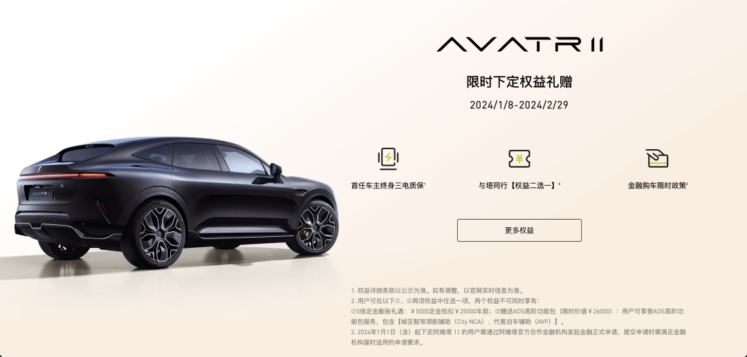 据各家车企发布的活动信息显示,1月1日,领克09 MHEV官方指导价下调1万元,最新指导价为24.79万-30.29万元,并推出焕新购车礼;1月4日,零跑汽车宣布最高每辆汽车可享1.7万元尾款抵扣券;哪吒汽车则推出购买哪吒GT可享5000元专项红包活动,或最高两万元金融权益;1月8日,阿维塔11鸿蒙版智享升级款正式上市,同时推出限时二选一购车权益:赠送限时价值2.6万元高阶智驾包,或5000元定金抵扣2.5万元车款,相当于直接优惠两万元。