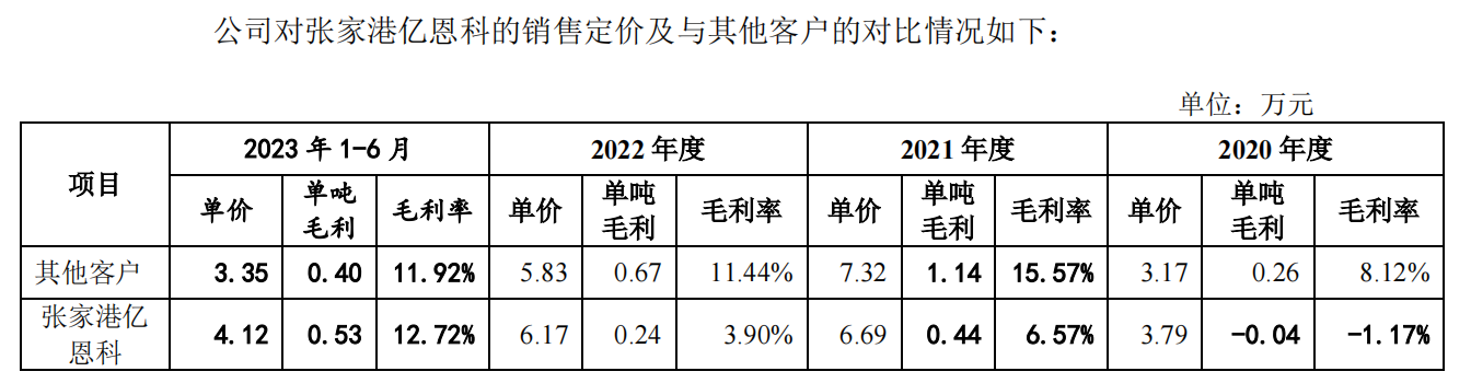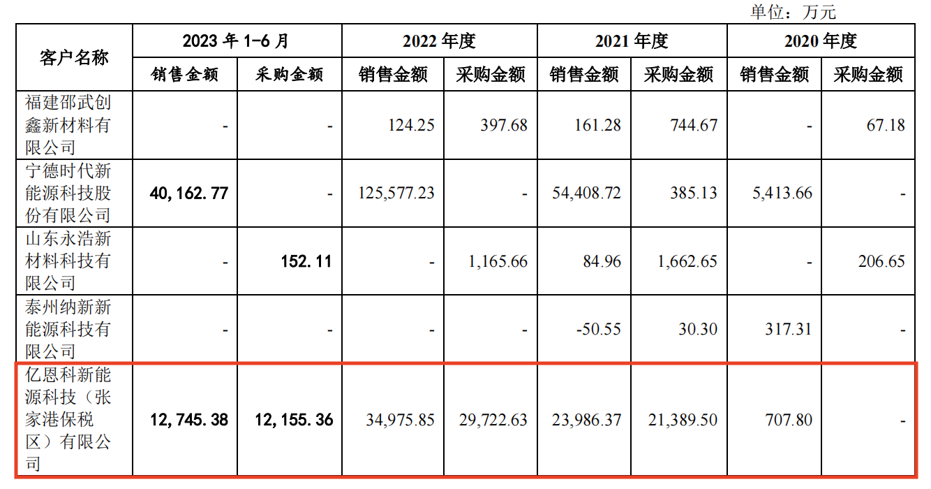 除客户集中度高以外,昆仑新材还存在部分客户与供应商重合的情形。其中,比较特殊的是亿恩科新能源科技(张家港保税区)有限公司(下称亿恩科)。亿恩科除了是公司的第二大客户外,也是其第一大供应商。且2021年至去年上半年,昆仑新材向亿恩科销售、采购的金额基本相当。![]()