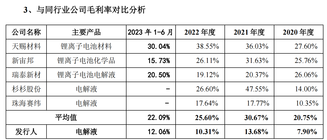 相比之下,可比公司大多采用上下游一体布局,生产锂离子电池电解液所用的溶质锂盐、溶剂和添加剂部分或全部来源于自行生产,因此可同时赚取两个环节的毛利。