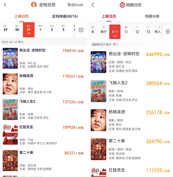 而从外部环境来说,如果后续没有重磅新片补上的话,2024年或将成为近年类型最单一的一届春节档——《第二十条》《热辣滚烫》《飞驰人生2》《红毯先生》虽然分属不同垂直类型,但都是现代背景的喜剧电影,《我们一起摇太阳》虽然是“生命三部曲”终章、纪实报道故事改编,但也带有喜剧元素。市场上缺乏过去几年春节档中《流浪地球2》为代表的科幻、《深海》为代表的成人向动画、《红海行动》《水门桥》为代表的战争大片,也没有《满江红》等古装类型。