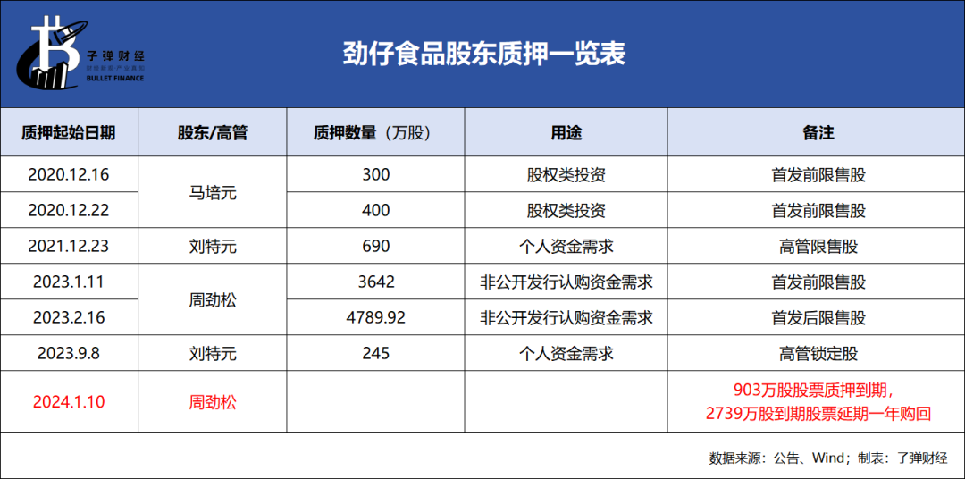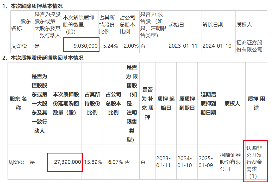 在2023年业绩预告发布约2小时后,劲仔食品发布公告称,周劲松将903万股股票办理了解除质押。与此同时,周劲松将2739万股质押股份延期至2025年1月赎回。
