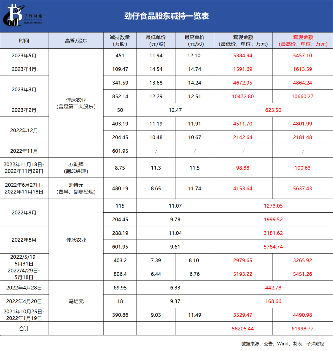 据「界面新闻·子弹财经」不完全统计,自2021年10月至2023年5月期间,前第二大股东佳沃农业、外部劲仔食品董事兼副总经理刘特元、劲仔食品副总经理苏彻辉及劲仔食品引入的第一个股东马培元纷纷减持。