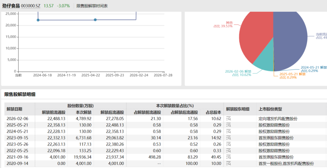 按照规定,劲仔食品部分限售股票自上市1年后(2021年9月)开始陆续解禁。